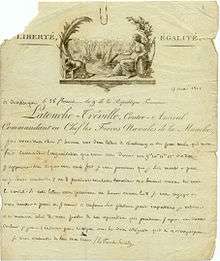Upon Latouche's return in France, he was appointed to direct Rochefort harbour.[17] He was also tasked with drawing a map of Oléron,[17] which was published in the first volume of Hydrographie française.[17][23][Note 7] In 1784 he succeeded Bruni d'Entrecasteaux as vice-director of the Harbours and Arsenals, holding the position until 1787, when he became Chancellor to the Duke of Orléans.[17] Meanwhile, he had also served as an inspector for the gunnery school of the Naval Academy,[17] and co-authored the Naval Code for 1786.[1][23] In July 1786, he sailed a corvette from Honfleur to Le Havre, ferrying king Louis XVI.[17]