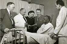 Louis T. Wright and colleagues at patient bedside, Harlem Hospital, New York, N.Y. From left to right: Dr. Lyndon M. Hill, Dr. Louis T. Wright, Dr. Myra Logan, Dr. Aaron Prigot, unidentified African American woman patient, and unidentified hospital employee.