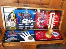 A love tester machine (also called love meter or love teller) is a type of amusement personality tester machine, which upon receiving credit tries to rate the subject's sex appeal, love abilities or romantic feelings for someone. Many love testers measure the moisture on the skin surface of the subject's hands by electrically testing the skin conductance and rates them accordingly. Others measure the temperature of the skin. However some machines just use a random generator. Love meters could be found in penny arcades, and can be seen in modern video arcades, amusement parks, in bars and restaurants. Such vending machines are for amusement purposes only and do not actually give a real result.[1] Nintendo, in their early years, once created a Love Tester.