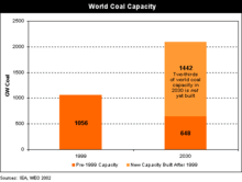 World energy consumption is predicted to increase from 421 quadrillion British Thermal Units (BTU) in 2003 to 722 quadrillion BTU in 2030.[58] Coal consumption is predicted to nearly double in that same time.[59] The fastest growth is seen in non-OECD Asian countries, especially China and India, where economic growth drives increased energy use.[60] By implementing low carbon power options, world electricity demand could continue to grow while maintaining stable carbon emission levels.