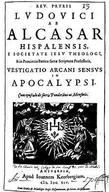 He is known for his Vestigatio arcani sensus in Apocalypsi (1614) published after his death, putting forward what would later be called a preterist view of Biblical prophecy, in commentary on the Book of Revelation; his work is regarded as the first major application of the method of interpretation of prophecy by reading in terms of the author's contemporary concerns.[5] His view was that everything in the Apocalypse, apart from the three final chapters, refers to events that already have come to pass. He attacked Joachim of Fiore, in particular, for millenarianism.[6] The book's illustrations were after Juan de Jáuregui y Aguilar, who produced a series of 24 designs on the Apocalypse.[7] He suggested that 2 Esdras was later than Revelations, and borrowed from it.[8]