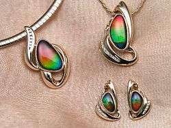 Ammolite is an opal-like organic gemstone found primarily along the eastern slopes of the Rocky Mountains of North America. It is made of the fossilized shells of ammonites, which in turn are composed primarily of aragonite, the same mineral contained in nacre, with a microstructure inherited from the shell. It is one of few biogenic gemstones; others include amber and pearl.1 In 1981, ammolite was given official gemstone status by the World Jewellery Confederation (CIBJO), the same year commercial mining of ammolite began. It was designated the official gemstone of the City of Lethbridge, Alberta in 2007.[2][3]