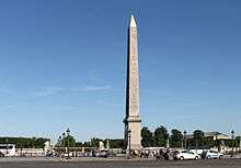 The Luxor Obelisk (French: Obélisque de Louxor) is a 23 metres (75 ft) high Egyptian obelisk standing at the center of the Place de la Concorde in Paris, France. It was originally located at the entrance to Luxor Temple, in Egypt. The Luxor Obelisk was classified as a historical monument in 1936.
