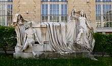 The buildings are arranged around a central courtyard, courtyards to the east and west, and to the north a courtyard for physical education and sports. Buildings included 47 classrooms and 17 studies, lecture rooms for physics (2), chemistry (2), history & geography (2). There is a collections room, drawing room, modeling workshops and a library. A screening room was equipped by M. Gaumont. The building includes four large apartments for senior staff and accommodation for 20 teachers and 20 domestic workers.[1] The decorations of the building included metal and ceramics.[3] A marble monument of Voltaire by Victor Ségoffin, meant for the Pantheon, now stands in the courtyard of the Lycee Voltaire.