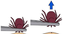 Attached ticks should be removed promptly, as removal within 36 hours can reduce transmission rates.[136] Folk remedies for tick removal tend to be ineffective, offer no advantages in preventing the transfer of disease, and may increase the risks of transmission or infection.[137] The best method is simply to pull the tick out with tweezers as close to the skin as possible, without twisting, and avoiding crushing the body of the tick or removing the head from the tick's body.[138] The risk of infection increases with the time the tick is attached, and if a tick is attached for fewer than 24 hours, infection is unlikely. However, since these ticks are very small, especially in the nymph stage, prompt detection is quite difficult.[136] The Australian Society of Clinical Immunology recommends against using tweezers to remove ticks but rather to kill the tick first by using a product to rapidly freeze the tick to prevent it from injecting more allergen-containing saliva. In a tick allergic person, the tick should be killed and removed in a safe place (e.g. an emergency department of a hospital).[139]