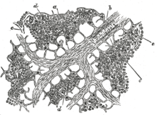 The lymph node capsule is composed of dense irregular connective tissue with some plain muscle fibers, and from its internal surface are given off a number of membranous processes or trabeculae, consisting, in humans, of connective tissue, with a small admixture of plain muscle fibers; but in many of the lower animals composed almost entirely of involuntary muscle. They pass inward, radiating toward the center of the gland, for about one-third or one-fourth of the space between the circumference and the center of the node. In some animals they are sufficiently well-marked to divide the peripheral or cortical portion of the gland into a number of compartments (follicles), but in humans this arrangement is not obvious. The larger trabeculae springing from the capsule break up into finer bands, and these interlace to form a mesh-work in the central or medullary portion of the gland. In these spaces formed by the interlacing trabeculae is contained the proper gland substance or lymphoid tissue. The gland pulp does not, however, completely fill the spaces, but leaves, between its outer margin and the enclosing trabeculae, a channel or space of uniform width throughout. This is termed the subcapsular sinus (lymph path or lymph sinus). Running across it are a number of finer trabeculæ of reticular connective tissue, the fibers of which are, for the most part, covered by ramifying cells.