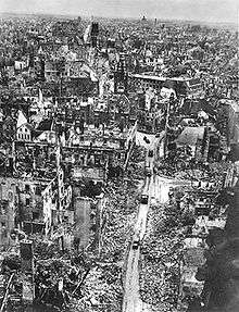 A secondary target of the Oil Campaign of World War II, Münster was bombed on October 25, 1944 by 34 diverted B-24 Liberator bombers, during a mission to a nearby primary target, the Scholven/Buer synthetic oil plant at Gelsenkirchen. About 91% of the Old City and 63% of the entire city was destroyed by Allied air raids.[8] The US 17th Airborne Division, employed in a standard infantry role and not in a parachute capacity, attacked Münster with the British 6th Guards Tank Brigade on 2 April 1945 in a ground assault and fought its way into the contested city centre, which was cleared in urban combat on the following day.[9]