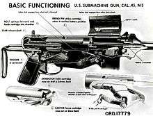 With its stamped, riveted, and welded construction, the M3 was originally designed as a minimum-cost small arm, to be used and discarded once it became inoperative.[14][15] As such, replacement parts, weapon-specific tools, and sub-assemblies were not made available to unit-, depot-, or ordnance-level commands at the time of the M3's introduction to service.[16][17] In 1944, a shortage of M3 submachine guns created by the need for interim production changes forced U.S. Army Ordnance workshops to fabricate pawl springs and other parts to keep existing weapons operational.[14][18]