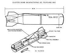 The 750-pound (340 kg) M43 BZ cluster bomb had a 16-inch (41 cm) diameter and a 66-inch (170 cm) length.[3] This cluster bomb was designed to hold three stacks of 19 M138 bomblets.[3] The bomblets each held about 6 ounces (170 g) of the incapacitating agent BZ, also known as 3-Quinuclidinyl benzilate.[3] The M43 was meant to be delivered from a subsonic aircraft and used a standard cluster adapter which would have tail fairing added to adapt it for high speeds.[4] The M43 cluster bomb was intended to cover an area of about 0.11 to 0.88 ha (0.27 to 2.17 acres) with BZ agent, which made it useful for attacking a squad or company sized element.[4] A weapon such as the M43 would have been best used against hard, high-value intelligence targets, in hostage or prisoner rescue situations, or in any other situation where friendly forces and enemy forces occupied the same area.[4]