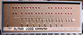 The Altair 8800 is a microcomputer designed in 1974 by MITS and based on the Intel 8080 CPU.[1] Interest grew quickly after it was featured on the cover of the January 1975 issue (published in late November 1974)[2] of Popular Electronics, and was sold by mail order through advertisements there, in Radio-Electronics, and in other hobbyist magazines. The designers hoped to sell a few hundred build-it-yourself kits to hobbyists, and were surprised when they sold thousands in the first month.[3] The Altair also appealed to individuals and businesses that just wanted a computer and purchased the assembled version.[4] The Altair is widely recognized as the spark that ignited the microcomputer revolution[5] as the first commercially successful personal computer.[6] The computer bus designed for the Altair was to become a de facto standard in the form of the S-100 bus, and the first programming language for the machine was Microsoft's founding product, Altair BASIC.[7][8]