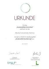 MODUL University was awarded 2nd place in the category "Structural Foundations," encouraging sustainable development at the 2010 Sustainability Awards [9] presented by the Austrian Federal Ministry of Agriculture, Forestry, Environment and Water Management and the Austrian Federal Ministry of Science and Research for its Sustainability Committee.[9] At the 2012 awards it won first place in the category "Structural Foundation" and third place in the category "Teaching & Curricula/International Cooperations". The committee gives two awards annually for the best ideas for sustainability implementable at the university; the Scholarship of Hope for students and the Employee Sustainability Award for the staff and faculty. Extracurricular activities such as movie nights and excursions to sustainable energy producers are also arranged by the Sustainability Committee.