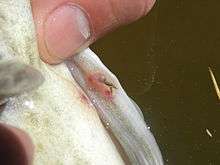 Murray cod have soft skin and very fine scales that leave them vulnerable to infection from exotic disease organisms. The following exotic disease organisms all seriously affect wild Murray cod; all have been introduced by imports of exotic fish. Chilodenella is a single-celled, parasitic protozoa that infects the skin of Murray cod and has caused a number of serious kills of wild Murray cod.[48] Saprolegnia is a fungus-like oomycete or "water mould" that frequently infects Murray cod eggs and the skin of Murray cod that have been roughly handled through poor catch and release technique.[48] (It is essential that Murray cod intended for release only touch cool wet surfaces and are not put down on any hard, dry, rough or hot surfaces, e.g. boat gunwales, boat floors, dry grass, dry rocks, gravel banks, dry towels or mats, etc. Hands should also be wetted before touching them. They must not be hung vertically by the mouth or gill covers.) Wild Murray cod populations across their range suffer extremely severe infestations of Lernaea or "anchor worm", a parasitic copepod vectored by introduced carp and that burrows into the skin of Murray cod.[48][49] Lernaea puncture wounds are often secondarily infected by bacteria.[50][51] Severe Lernaea infestations probably causes the death of many more adult Murray cod than commonly recognised.[52] Ebner[19] reports a young adult Murray cod seemingly killed by severe Lernaea infestation.