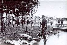 Murray cod were originally the most common large native fish in the Murray-Darling basin. Contrary to some fishery department literature, the first serious declines in Murray cod were caused by extremely severe overfishing. In the latter half of the 1800s and the early 1900s, Murray cod — very large, very long-lived fish — were caught in unimaginable numbers by both commercial and recreational fishermen. For example, one commercial fishing operation commenced on the Murray River near Echuca in 1855, targeting Murray cod over hundreds of kilometres of river, and yet within eight years, grave concerns over the sustainability of this operation, and complaints about the near-absence of Murray cod in their heavily fished grounds, were being raised in the main state newspaper, The Argus.[38] Yet, fishing effort continued to increase in the region, so in the late 1880s and early 1890s, between 40,000 and 150,000 kg of mostly Murray cod (between 7,500 and 27,000 fish, at an average weight of 5.5 kg) were caught near Echuca.[38] Similarly, in 1883, more than 147,000 kg of Murray cod were sent to Melbourne from just one river town (Moama).[9] By the 1920s Murray cod had been overfished to the point where large-scale commercial fishing operations were no longer feasible.[9][10] Recreational fishermen took similarly excessive hauls during this era, using rods and reels, handlines, setlines, drum nets, gill nets, and even explosives, with hauls often either wasted or illegally sold. Perhaps this extreme overfishing and its impacts of wild Murray cod stocks is best summarised by a short article in the Register News (a South Australian newspaper) in 1929: