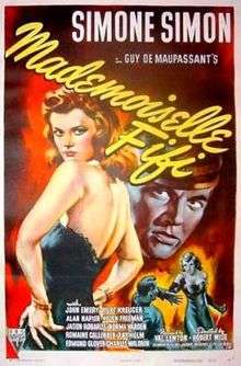Mademoiselle Fifi is a 1944 American period film directed by Robert Wise for RKO, in his solo directorial debut. It was written by Josef Mischel and Peter Ruric based on two short stories by Guy de Maupassant, "Mademoiselle Fifi" and "Boule de Suif". The film features an ensemble cast headed by Simone Simon, John Emery and Kurt Kreuger, and was produced by noted B-film producer Val Lewton. Produced during the Second World War, the film is guilty of instances of Propaganda common at the time, such as the overly harsh depictions of the Prussians, and the patriotic, freedom loving French characters who were liberated from German Occupation the year of its release.