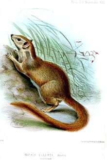 The Madras treeshrew (Anathana ellioti), also known as the Indian treeshrew, is a species of treeshrew in the monotypic genus Anathana found in the hill forests of central and southern India. The genus name is derived from the Tamil name of moongil anathaan (literally "bamboo squirrel") and the species name is after Sir Walter Elliot of the Indian Civil Services in Madras.
