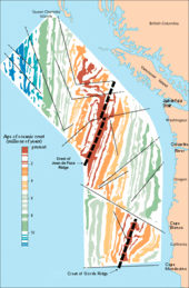 Magnetic surveys over the oceans have revealed a characteristic pattern of anomalies around mid-ocean ridges. They involve a series of positive and negative anomalies in the intensity of the magnetic field, forming stripes running parallel to each ridge. They are often symmetric about the axis of the ridge. The stripes are generally tens of kilometers wide, and the anomalies are a few hundred nanoteslas. The source of these anomalies is primarily permanent magnetization carried by titanomagnetite minerals in basalt and gabbros. They are magnetized when ocean crust is formed at the ridge. As magma rises to the surface and cools, the rock acquires a thermoremanent magnetization in the direction of the field. Then the rock is carried away from the ridge by the motions of the tectonic plates. Every few hundred thousand years, the direction of the magnetic field reverses. Thus, the pattern of stripes is a global phenomenon and can be used to calculate the velocity of seafloor spreading.[13][14]