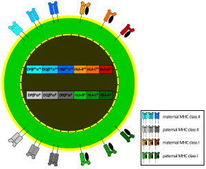 MHC alleles are expressed in codominant fashion.[13] This means the alleles (variants) inherited from both parents are expressed equally: