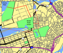 One week later, Mrs. Mallard leads the ducklings ashore and straight to the highway in hopes of crossing to reach the Garden, but she has trouble crossing as the cars will not yield to her. Michael, the policeman who the Mallards visited, stops traffic for the family to cross. Michael calls police headquarters and instructs them to send a police car to stop traffic along the route for the ducks. The ducks cross the highway, Embankment Road (Storrow Drive had yet to be constructed when the book was written), then proceed down Mount Vernon Street to Charles Street where they head south to the Garden. The people on the streets admire the family of ducks. When the family must cross Beacon Street to enter the Garden, there are four policeman standing in the intersection stopping traffic to make way for the ducklings. Mr. Mallard is waiting in the Public Garden for the rest of the family. Finally, the family decides to stay in the Garden and lives happily ever after.[1] They end each day searching for peanuts and food, and when night falls, they swim to their little island and go to sleep.