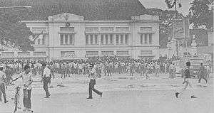 The next morning, thousands of students demonstrated in the streets of Jakarta, calling for lower prices, an end to corruption, and the disbanding of Aspri, Suharto's clique of personal assistants.[5][3] Although the demonstrations began peacefully, by the afternoon suspected Special Forces' agent provocateurs had turned it into a full riot.[3][5] Hundreds of cars were burned, mainly of Japanese make.[3] More stores were looted, including "the most visible symbol of Japanese presence in Indonesia", an Astra dealership selling Toyota-brand cars on Sudirman Street.[5][3]