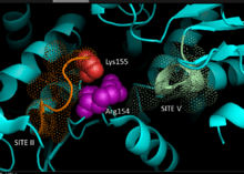 Based on crystallography data of homologous NADP-dependent malic enzymes of mammalian origin, a 3D model for C4 pathway NADP-ME in plants has been developed, identifying the key residues involved in substrate-binding or catalysis. Dinucleotide binding involves two glycine rich GXGXXG motifs, a hydrophobic groove involving at least six amino acid residues, and a negatively charged residue at the end of the βB-strand.[5][6] The primary sequence of the first motif, 240GLGDLG245, is a consensus marker for phosphate binding, evidencing involvement with NADP binding, while the other glycine rich motif adopts a classical Rossman fold—also a typical marker for NADP cofactor binding.[7] Mutagenesis experiments in maize NADP-ME have supported the current model.[1] Valine substitution for glycine in either motif region rendered the enzyme completely inactive while spectral analysis indicated no major changes from wild-type form. The data is suggestive of direct impairment at a key residue involved in binding or catalysis rather than an inter-domain residue influencing conformational stability. Additionally, a key arginine residue at site 237 has been shown to interact both with malate and NADP+ substrates, forming key favorable electrostatic interactions to the negatively charged carboxylic-acid and phosphate group respectively. Elucidation of whether the residue plays a role in substrate binding or substrate positioning for catalysis has yet to be determined.[8] Lysine residue 255 has been implicated as a catalytic base for the enzymes reactivity; however, further studies are still required to conclusively establish its biochemical role.[1]