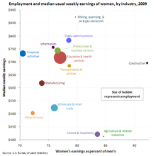 Women's median weekly earnings were lower than men's median weekly earnings in all industries in 2009. The industry with the largest gender pay gap was financial activities. Median weekly earnings of women employed in financial activities were 70.5% of men's median weekly earnings in that industry. Construction was the industry with the smallest gender pay gap, with women earning 92.2% of what men earned.[13][14]