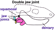 One such feature available for paleontology, shared by all living mammals (including monotremes), but not present in any of the early Triassic therapsids, is shown in figure 1: mammals use two bones for hearing that all other amniotes use for eating. The earliest amniotes had a jaw joint composed of the articular (a small bone at the back of the lower jaw) and the quadrate (a small bone at the back of the upper jaw). All non-mammalian tetrapods use this system including amphibians, turtles, lizards, snakes, crocodilians, dinosaurs (and their descendants the birds), ichthyosaurs, pterosaurs and therapsids. But mammals have a different jaw joint, composed only of the dentary (the lower jaw bone, which carries the teeth) and the squamosal (another small skull bone). In the Jurassic, their quadrate and articular bones evolved into the incus and malleus bones in the middle ear.[5][6] Mammals also have a double occipital condyle; they have two knobs at the base of the skull that fit into the topmost neck vertebra, while other tetrapods have a single occipital condyle.[5]