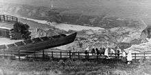 The canal would often freeze in winter, so an icebreaker was used to ensure the canal remained navigable during the cold weather. Named "Sarah Lansdale"[46] and owned by James Crompton Paperworks, it was towed by a team of horses while the crew stood astride the deck, secured to the handrails, rocking the boat from side to side and breaking the ice in the process. Often, ice would be encountered that was so thick the boat would rise up onto the surface of the ice.[47] This boat did once reside at the boat museum in Ellesmere Port Dock[46] but was later destroyed by fire.