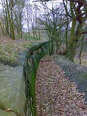 There are several notable features along the canal, including Prestolee Aqueduct and Clifton Aqueduct, both of which are Grade II listed structures.[77][78] Nob End Locks (sometimes referred to as Prestolee Locks) sit at the junction of the three arms of the canal at Nob End. They comprise two sets of three staircase locks, separated by a passing basin. These locks served to lower the level of the canal by 64 feet (20 m) over a distance of 600 feet (183 m). The upper staircase is still visible, but most of the lower staircase was filled in at some point in the 1950s, and much of the stonework was removed.[79]