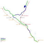 Thirty three bridges were constructed, along with stone drainage facilities to keep water from the cuttings.[28] The railway company was forced to change the design of some of these bridges, as insufficient room was given for the locomotives and carriages on the track to pass between the bridge supports, which were only 10 feet (3.0 m) wide. With only 12 inches (30 cm) of space between some vehicles and the bridge supports, a report by the Inspector of Railways on 11 December 1846 concluded that they were dangerous. On 19 November 1842 a guard named William Parker was killed on the railway, his skull found fractured, and on 26 July 1844 a guard named James Cook was killed as he leant out and was struck by a support. It was also reported that the distance between rails at these bridges was only 4 feet (1.2 m), whereas the normal distance was 6 feet (1.8 m).[27]