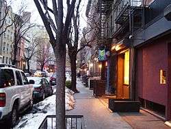 The East Village's performance and art scene has declined since its height in the 1970s and 1980s.[15] One club that tried to resurrect the neighborhood's past artistic prominence was Mo Pitkins' House of Satisfaction, part-owned by Jimmy Fallon of Saturday Night Live. The venue's past performers include figures such as Murray Hill, Rob Corddry, Rachel Dratch, Amy Poehler, Moby, and Debbie Harry.[16] It closed its doors in 2007. A study done by Fordham University notes the decline of the East Village performance and art scene, and how "the young, liberal culture that once found its place on the Manhattan side of the East River" has shifted in part to new neighborhoods like Williamsburg in Brooklyn.[17][18] Rapture Cafe also shut down in April 2008, and the neighborhood lost an important performance space and gathering ground for the gay community. There are still some performance spaces, such as Sidewalk Cafe on 6th Street and Avenue A, where downtown acts find space to exhibit their talent, and the poetry clubs Bowery Poetry Club and Nuyorican Poets Café.[19]