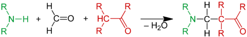 The Mannich reaction is an organic reaction which consists of an amino alkylation of an acidic proton placed next to a carbonyl functional group by formaldehyde and a primary or secondary amine or ammonia. The final product is a β-amino-carbonyl compound also known as a Mannich base.[1] Reactions between aldimines and α-methylene carbonyls are also considered Mannich reactions because these imines form between amines and aldehydes. The reaction is named after chemist Carl Mannich.[2][3]