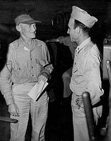 Mitscher was a quiet man. He rarely spoke, never engaged in small talk, and he would never discuss mission details at the mess table. On the rare occasions when he would enter into conversation it would be about fishing, a love of which he picked up in his middle years.[44] Mitscher relaxed by reading inexpensive murder mysteries, and when at sea he would always have one with him.[45] Though he appeared distant and severe to those that did not know him, in truth he held a deep affection for his men and was the possessor of a dry sense of humor. An example of his humor is displayed in his gentle ribbing of his chief-of-staff, Captain Arleigh Burke. Burke had come to Mitscher from destroyers, and it was well known that he preferred a fighting command over his new role as chief-of-staff. When a destroyer came alongside to refuel from the carrier, the admiral directed a Marine sentry nearby: "Secure Captain Burke, till that destroyer casts off."[46]