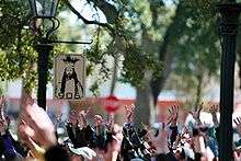 After 1902 the use of masks were largely limited to mystic societies or children under 12.[1] In 1918, public masking was forbidden in Mobile during World War I (repealed in 1920);[1] by 1947, masks were limited to mystic societies only, plus a masked individual was forbidden to "wear gloves or have his hands concealed" or covered.[1] After 1957, the general public were allowed to wear masks, but only on Mardi Gras day from 9a.m.–9p.m., or as members of mystic societies.[1]