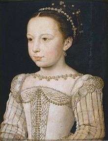 Margaret was born Marguerite de Valois on May 14, 1553, at the royal Château de Saint-Germain-en-Laye, the seventh child and third daughter of Henry II and Catherine de' Medici.[1] Three of her brothers would become kings of France: Francis II,[1] Charles IX[1] and Henry III. Her sister, Elisabeth of Valois, would become the third wife of King Philip II of Spain. In 1565, her mother Catherine met with Philip II's chief minister Duke of Alba at Bayonne in hopes of arranging a marriage between Margaret and Philip's son Don Carlos.[2] However, Alba refused any consideration of a dynastic marriage.[2]