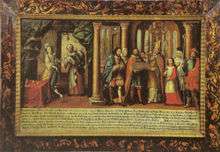 Another early illustration of Margaret's fate can be found in the chapel of Thierberg Castle in Kufstein. It was painted by Michael Waginger and shows both the insult of the beggar and the baptism of many small children.
