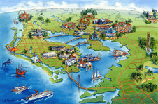 After moving to Richmond, VA in 1994, Maria continued to work in watercolors, drawing with pencil and ink, with an emphasis on architectural renderings, urban and country landscapes. She then extended her talents in traditional art into the electronic arts. As a mixed-media artist, she frequently merges both art forms in creating her illustrated maps and other illustration, to achieve the warmth of hand creations combined with the utility and flexibility of layers and PDFs needed for production and proofing. Maria Rabinky became a well-known map illustrator creating pictorial maps for various applications.