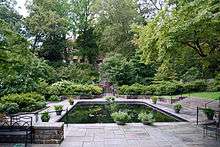 Coffin's designs were distinguished by her use of "dramatic contrasts in color, inclusion of wildflowers and woodland plantings, and site unity through effective transition spaces."[23] She was especially noted for her ability to effectively incorporate functional areas such as tennis courts and putting greens with ornamental areas such as allées.[23] Her willingness to innovate made her a particularly sought-after designer as clients came to value a more adventurous approach to landscape architecture. She put into practice the idea put forward in 1918 by Elsa Rehmann that a garden should be a "manifestation of distinctive individuality, an expression of personality."[24] By the 1920s, Rehmann's views had become fashionable and gardens became seen as a vehicle for expressing the private self.[24]