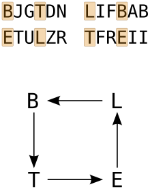 Rejewski studied these related pairs of letters. For example, if there were four messages that had the following indicators on the same day: BJGTDN, LIFBAB, ETULZR, TFREII, then by looking at the first and fourth letters of each set, he knew that certain pairs of letters were related. B was related to T, L was related to B, E was related to L, and T was related to E: (B,T), (L,B), (E,L), and (T,E). If he had enough different messages to work with, he could build entire sequences of relationships: the letter B was related to T, which was related to E, which was related to L, which was related to B (see diagram). This was a "cycle of 4", since it took four jumps until it got back to the start letter. Another cycle on the same day might be AFWA, or a "cycle of 3". If there were enough messages on a given day, all the letters of the alphabet might be covered by a number of different cycles of various sizes. The cycles would be consistent for one day, and then would change to a different set of cycles the next day. Similar analysis could be done on the 2nd and 5th letters, and the 3rd and 6th, identifying the cycles in each case and the number of steps in each cycle.[33]