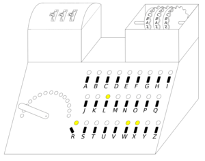The Enigma machine was an electromechanical device, equipped with a 26-letter keyboard and 26 lamps, corresponding to the letters of the alphabet. Inside was a set of wired drums (rotors and a reflector) that scrambled the input. The machine used a plugboard to swap pairs of letters, and the encipherment varied from one key press to the next.[21] For two operators to communicate, both Enigma machines had to be set up in the same way. The large number of possibilities for setting the rotors and the plugboard combined to form an astronomical number of configurations, and the settings were changed daily,[Note 2] so the machine code had to be "broken" anew each day.[23]
