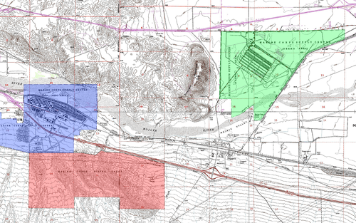 Map of the location of the three units of MCLB. The Nebo Annex is blue, Yermo Annex is green, and the firing range is red.