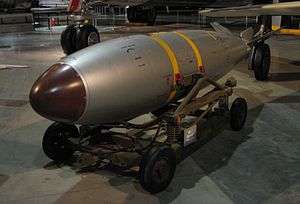 Mark 7 "Thor" (or Mk-7'[1]) was the first tactical fission bomb adopted by US armed forces. It was also the first weapon to be delivered using the toss method with the help of the low-altitude bombing system (LABS). The weapon was tested in Operation Buster-Jangle. To facilitate external carry by fighter-bomber aircraft, Mark 7 was fitted with retractable stabilizer fins. The Mark 7 warhead (W7) also formed the basis of the 30.5 inches (775 mm) BOAR rocket, the Mark 90 Betty nuclear depth charge, MGR-1 Honest John rocket, and MGM-5 Corporal ballistic missile. It was also supplied for delivery by Royal Air Force Canberra aircraft assigned to NATO in Germany under the command of SACEUR. This was done under the auspices of Project E - an agreement between the USA and the UK on the RAF carriage of US nuclear weapons. In UK use it was designated 1,650 lb. H.E. M.C.[2] The Mark 7 was in service from 1952 to 1967(8) with 1700-1800 having been built.[3]