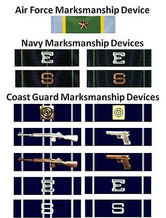 The Navy and Coast Guard present two marksmanship ribbon devices for scoring as a Sharpshooter or Expert on a pistol and rifle qualification course: the bronze colored S Device and E Device for the Navy and silver colored S Device and E Device for the Coast Guard. The Air Force uses a 3⁄16" bronze star to indicate expert qualification in both rifle and service pistol. The Coast Guard also has additional ribbon devices which represent accomplishments in Civilian Marksmanship Program (CMP) sanctioned competitions.[1][2][3][4][5]