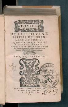 - ↑ Marsilio Ficino. Biography and introduction to The Letters of Marsilio Ficino, Volume 1 1975 Fellowship of the School of Economic Science, London. Retrieved 26 April 2014.
