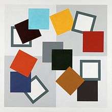 Webb’s paintings and prints are consistently square in shape and exist as an arrangement of vivid squares and rectangles.[4] Her work is held by several public art collections, including the Arts Council Collection, Sainsbury Centre (UEA), Kettle’s Yard, and The Sonia Delaunay Collection (Paris).[5] A one-person survey show of her work was held at the Sainsbury Centre for Visual Arts in 2011 which then toured to the Hatton Gallery, Newcastle University in 2012. Titled ‘Mary Webb: Journeys in Colour’, it contained more than 60 paintings, along with screen prints, drawings and collages including a series of paintings that were inspired by time she spent in Utah.[4]