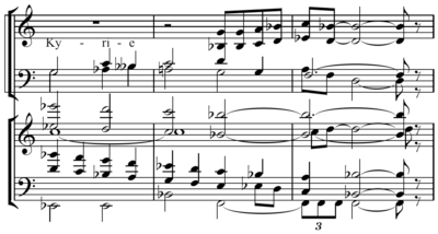Like his 1955 work Canticum Sacrum, the Mass forms a symmetrical plan on a large-scale. The outer movements (the Kyrie and the Agnus Dei) contain homophonic choral statements with instrumental interludes, and share a tonal vocabulary including octatonic, diatonic, and modal scales. By contrast, movements 2 and 4 (the Gloria and the Sanctus) feature florid solo lines which alternate with the choral statements, and the harmony is more recognizably and consistently diatonic.[3] The central movement, the Credo, is the longest. It features static, syllabic, and declamatory text-setting with a limited harmonic and rhythmic vocabulary. Long stretches of text often repeat a single chord, evoking the reciting tone of Gregorian chant or the Orthodox liturgical chant that Stravinsky would have known from his childhood in Saint Petersburg. Clear setting of the text is favored over an expressive interpretation of its meaning.[3] The music features examples of polyvalency.[2]