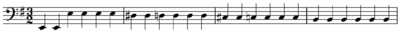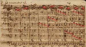 The second acclamation of God is a four-part choral fugue, set in stile antico, with the instruments playing colla parte.[22] The style was preferred at court in Dresden.[11] The theme begins with intervals such as minor seconds and major seconds, similar to the motif B-A-C-H. The first entrances build from the lowest voice in the sequence bass, tenor, alto, soprano.[26] According to Christoph Wolff, Bach assimilated the stricter style of the Renaissance only in the early 1730s, after he had composed most of his cantatas, and this movement is his first "significant product" in the style.[13]