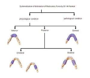 According to this systematization, the force of Masticatory is divided in two main groups, with physiological or pathological condition. The physiological Masticatory Force with is divided into three different subgroups according to their localizations, anterior, general (covering the entire arch) and posterior part of arch, which is also divided into two different groups; unilateral and bilateral.[7]