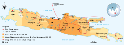 In the latter half of the 16th century, the Sultanate of Demak, the dominant power in the island of Java, disintegrated into multiple independent states.[6] At the turn of the 17th century, three such states emerged as the leading powers: the Sultanate of Banten in western Java, the Sultanate of Mataram in inland central Java, and the Duchy of Surabaya in coastal eastern Java.[7][8] Mataram consolidated its power by absorbing other principalities: Pajang in c. 1588, Demak (1588), Madiun (c. 1590) and Kediri (c. 1591).[9] Following Mataram's unsuccessful westward expedition against Banten in c. 1597, Mataram turned its expansion eastward, into areas under the influence of Surabaya.[9]