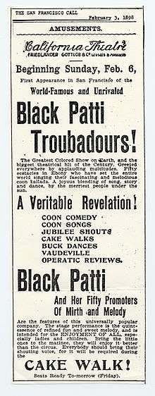 Several members of the troupe, such as Bert Williams, went on to become famous.[1] April 1908, at the Avenue Theatre in Louisville, Kentucky, an audience made up mostly of whites (segregated seating was still prevalent), accepted Madam ‘Patti’ after singing ‘My Old Kentucky Home’ with much respect and admiration, and marked “the first time that a colored performer received a bouquet at the theatre in this city”.[12] For almost ten years, racial segregation had kept Jones from the mainstream opera platform, but by singing selections from operas within the context of a hard-traveling minstrel and variety show, she was still able to utilize her gifted voice, that people of all races loved.[12] The Black Patti Troubadours reveled in vernacular music and dance.[12]