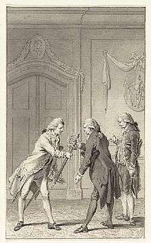 The envoys Mattheus Lestevenon and Gerard Brantsen presenting vice-admiral Pierre André de Suffren with a golden sword in 1784 (engraving by Jacobus Buys)